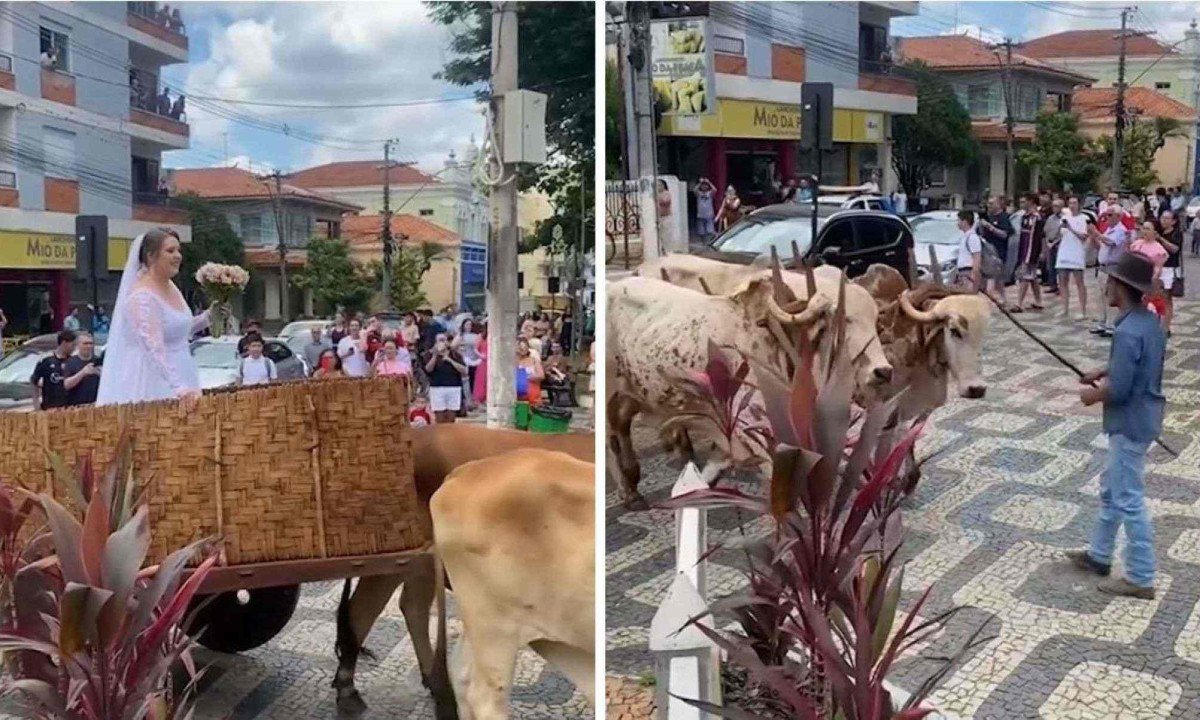 Uma noiva parou a cidade de Santa Rita do Sapucaí (MG), no Sul do estado, pelo jeito inusitado como chegou à igreja para o próprio casamento. Lariane Rodrigues Ribeiro, de 27 anos, apareceu em um um carro de boi. A cena foi registrada em vídeo por convidados e moradores da cidade e logo viralizou nas redes sociais.