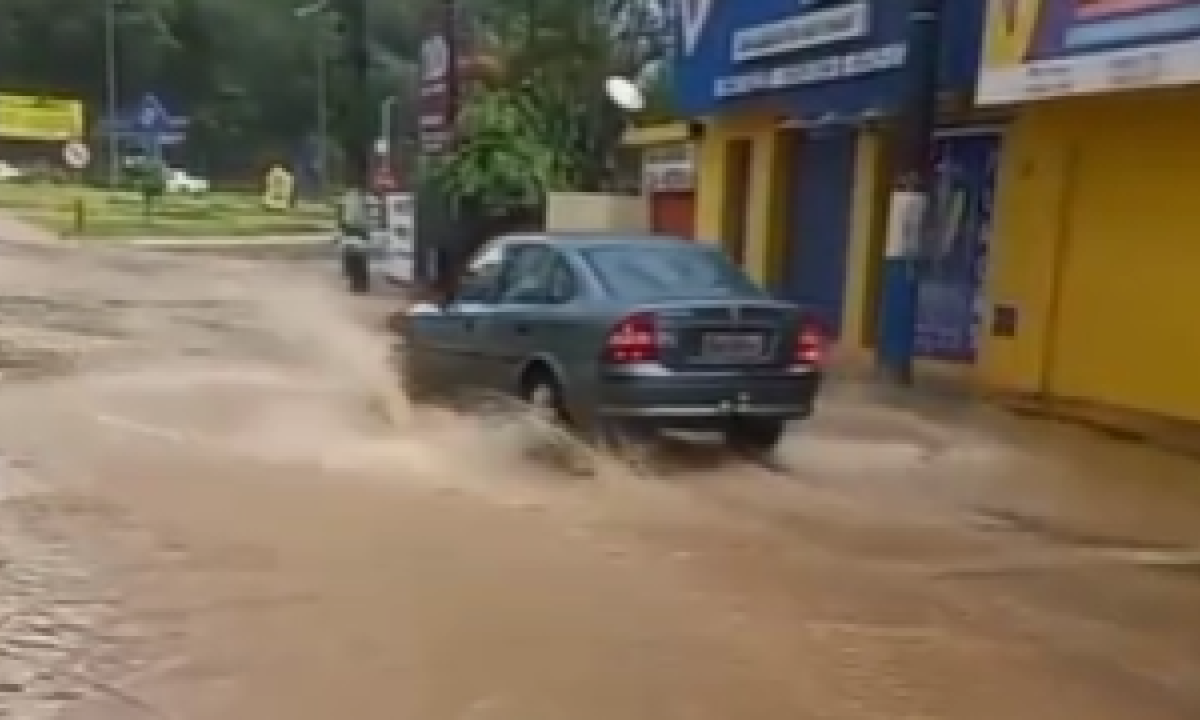 As imagens mostram, além da via tomada pela água, alguns motoristas se arriscando a atravessar a enxurrada, mesmo diante do risco.