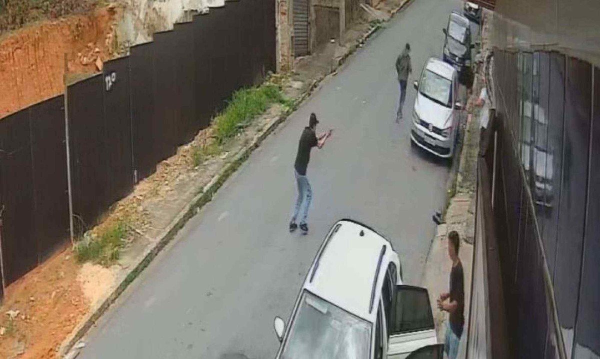 Pouco mais de um minuto depois, dois homens, que estavam no banco de trás, saem do veículo. Um deles está armado e dispara contra o policial. O servidor chegou a pegar uma arma, que estava em sua cintura, mas não conseguiu atingir os rivais.