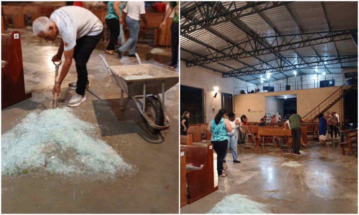 Os voluntários recolheram estilhaços de vidro e realizaram a limpeza da igreja, permitindo que a matriz estivesse pronta para as celebrações ainda na noite de sexta-feira.