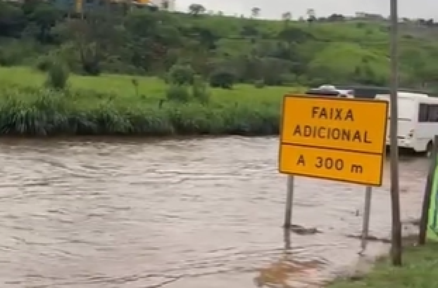 Vídeos que circulam nas redes sociais mostram a extensão do alagamento, que bloqueou o trânsito nos dois sentidos da rodovia.
