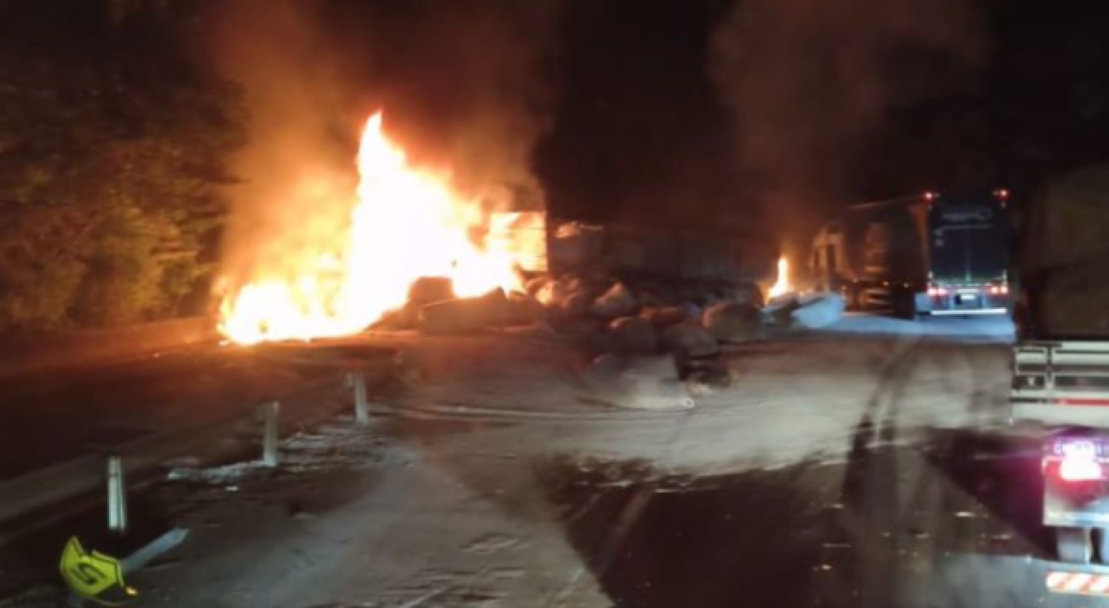 Uma carreta tombou, pegou fogo e interditou a BR-381 na noite dessa sexta-feira (5/12), em Brumadinho, na Região Metropolitana de Belo Horizonte. O acidente ocorreu no KM 526,8 da rodovia, trecho conhecido como Serra de Igarapé, no sentido capital mineira.