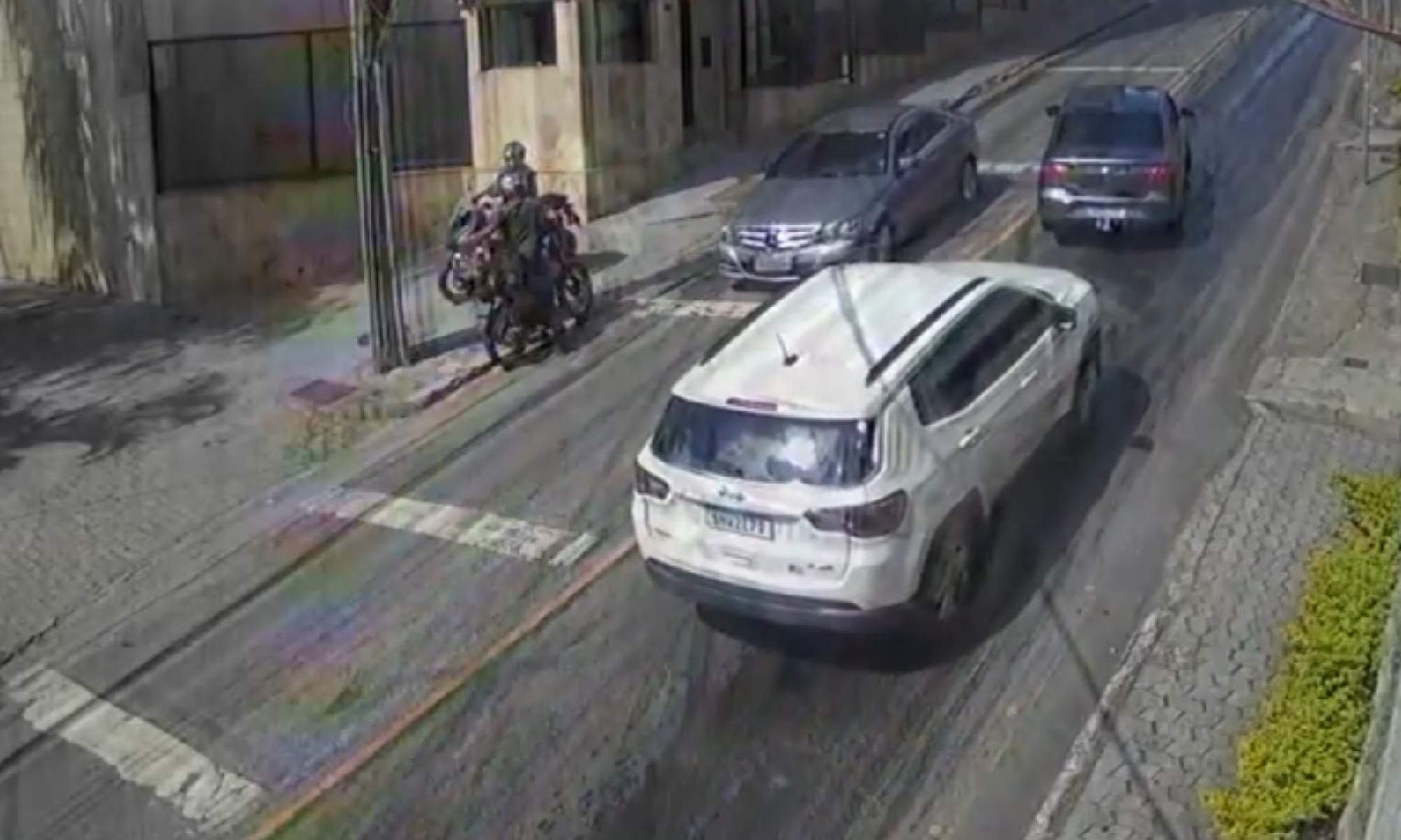 Imagens capturadas por uma câmera de segurança mostram vários carros com dificuldade de subir e até mesmo deslizando rua abaixo.
