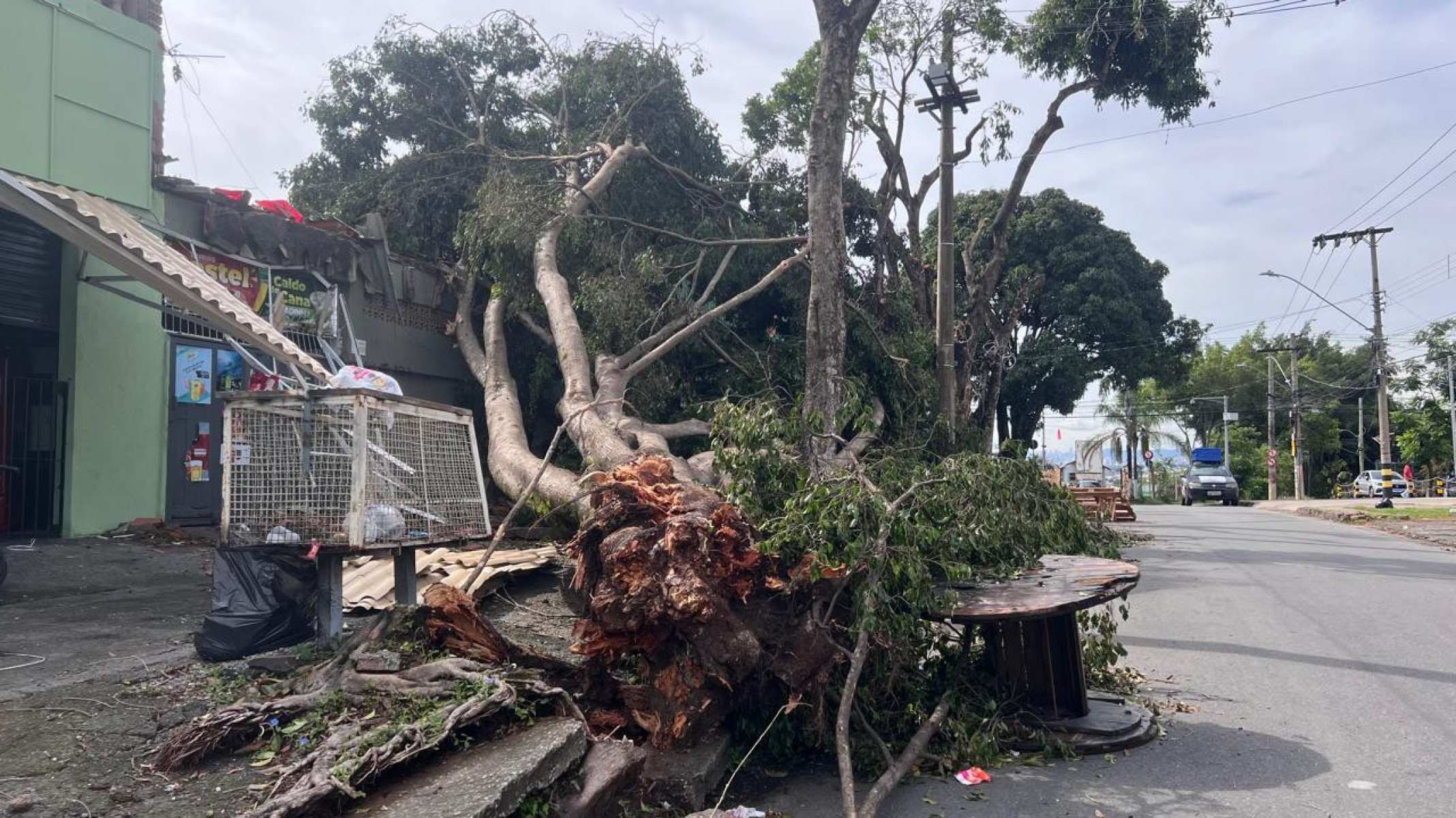 Com a forte chuva da noite desse domingo (14/12), a espécime caiu em cima da casa de Flávia, causando um estrago ainda maior. A reportagem flagrou a árvore caída na rua. Nas imagens, é possível observar a raiz exposta e o tamanho da árvore.