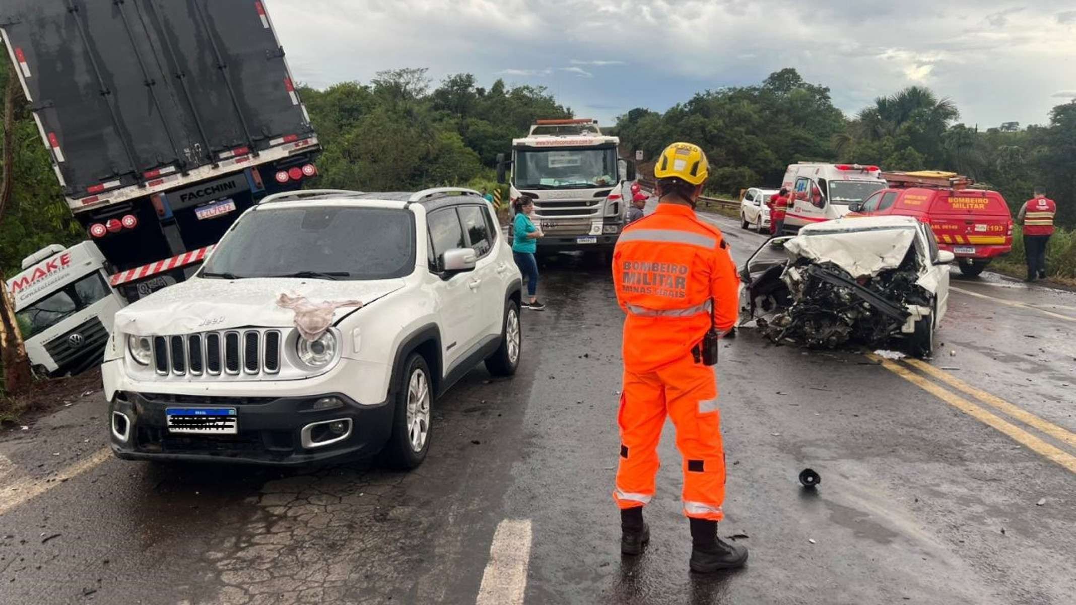 De acordo com o Corpo de Bombeiros, militares de Ituiutaba (MG) atenderam a ocorrência. No local, a carreta e um Mitsubishi ASX estavam fora da pista, e um Jeep Renegade e um Volkswagen Polo ficaram sobre a rodovia.