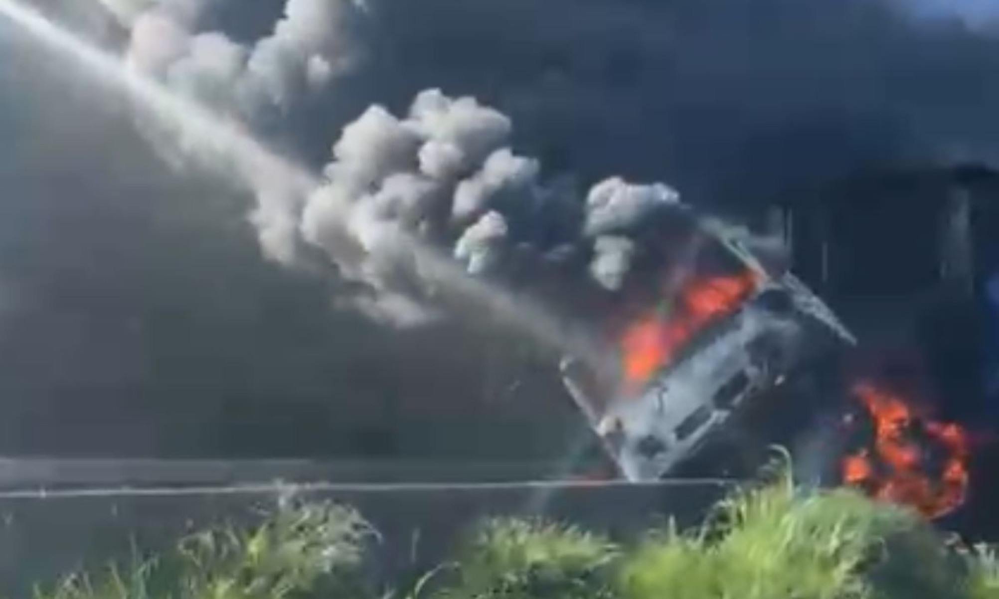 Imagens compartilhadas nas redes sociais mostram o caminhão tombado com grande parte do fogo concentrado na roda dianteira esquerda. A fumaça densa e escura era vista a uma longa distância.