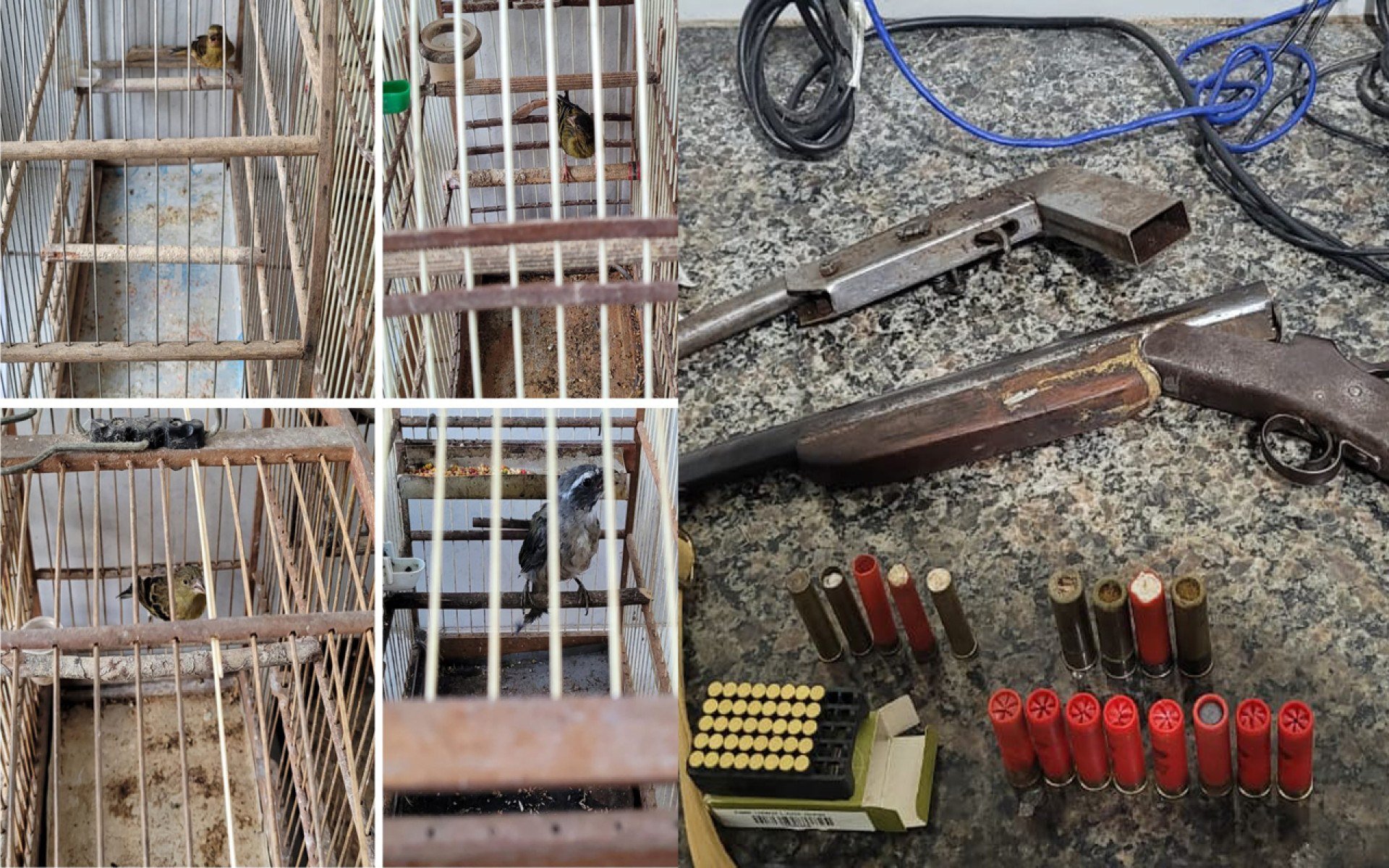 Os militares se dirigiram à zona rural de Serra Pirapetinga onde encontraram oito pássaros engaiolados – sendo quatro de espécies da fauna silvestre e quatro híbridos (misturas de animais nativos com exóticos) –, oito gaiolas de madeira, uma espingarda calibre 24, uma arma artesanal calibre 36 e 57 munições de diversos calibres.