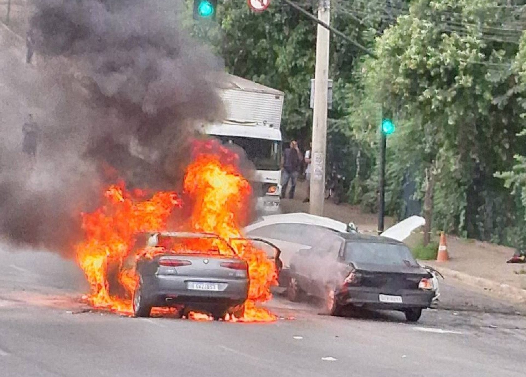 Um caminhão desgovernado atingiu três carros na tarde desta segunda-feira na Avenida Marechal Castelo Branco, no Bairro JK, em Contagem, na Região Metropolitana de Belo Horizonte. Com o impacto, um dos veículos pegou fogo. O motorista de um Fiat Linea envolvido no acidente precisou ser hospitalizado: ele foi socorrido com ferimentos na face e queixava-se de dores na região lombar da coluna.