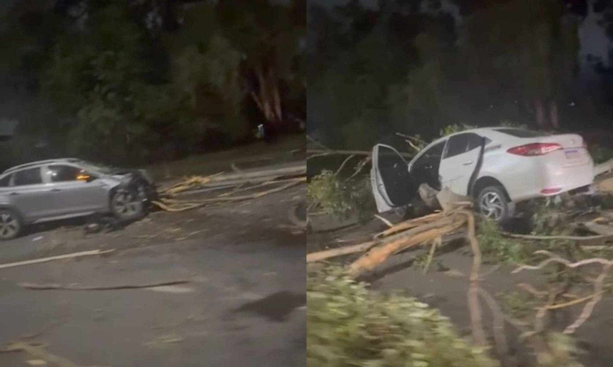 Batida frontal entre carros seguida da queda de um eucalipto de grande porte não deixou vítimas. Bombeiros retiraram a árvore e liberaram a via de madrugada