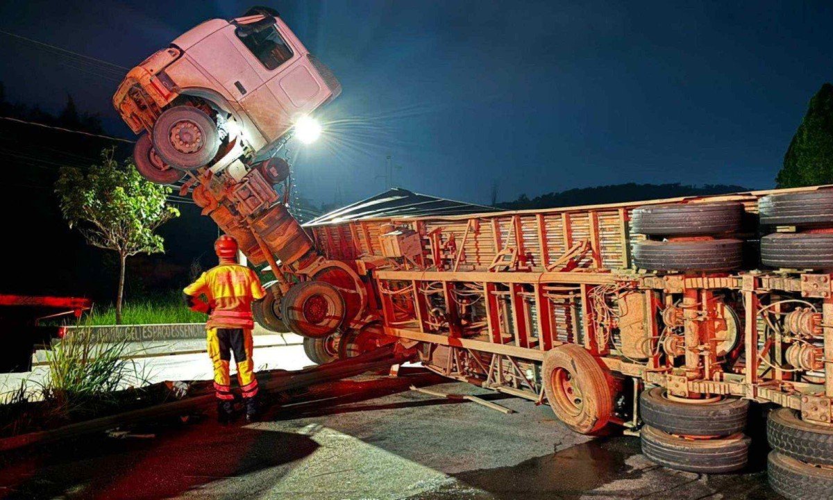 O veículo tinha uma carga de carvão e tombou na Rua Quatro, no bairro Brasiléia. De acordo com o Corpo de Bombeiros Militar de Minas Gerais (CBMMG), com o tombamento da carga, a carreta ficou em formato de “L” e a cabine ficou suspensa a cinco metros de altura.