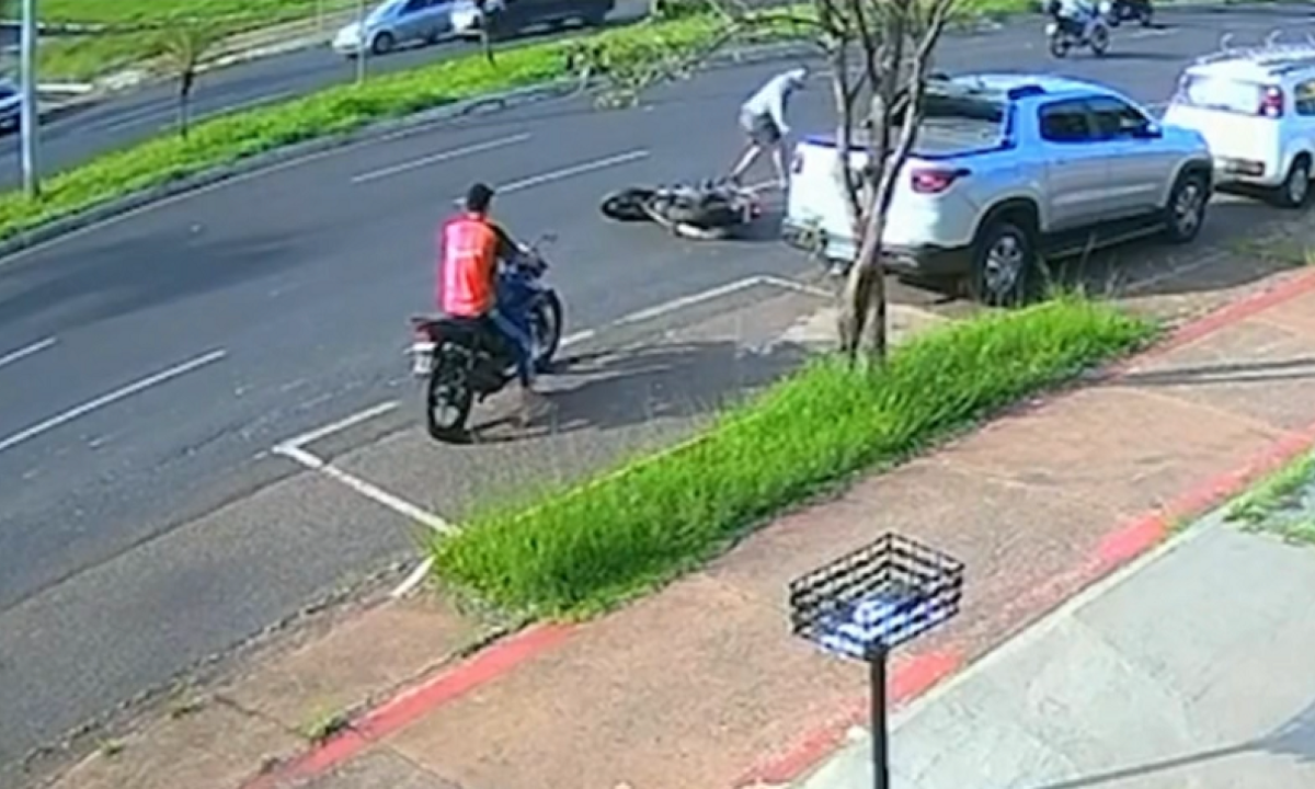 As imagens mostram dois suspeitos chegando em outra motocicleta. O garupa desce, vai até uma moto estacionada e tem dificuldade para ligá-la, enquanto o comparsa fica de olheiro no meio do trânsito da avenida Rondon Pacheco.