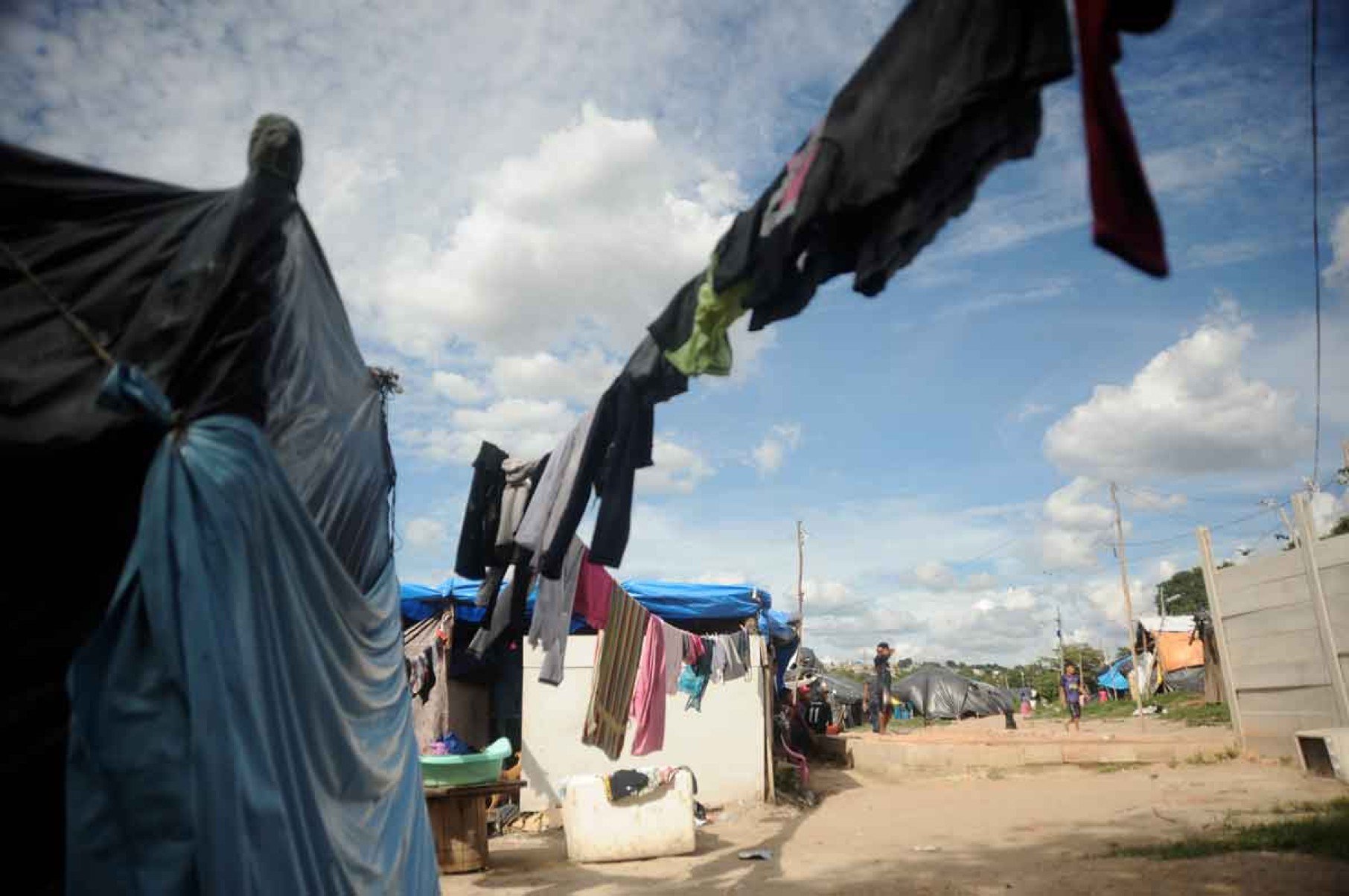 Em um terreno sem pavimento, barracas improvisadas, construídas com pedaços de madeira e lona, estão amontoadas. Ao seu redor, há tijolos empilhados, mato alto, roupas estendidas nos varais, resíduos e objetos pessoais jogados no chão. No local, não há acesso regular à água potável, energia elétrica ou saneamento básico. Assim vivem indígenas da etnia Warao, imigrantes da Venezuela, em Betim, na Região Metropolitana de Belo Horizonte.