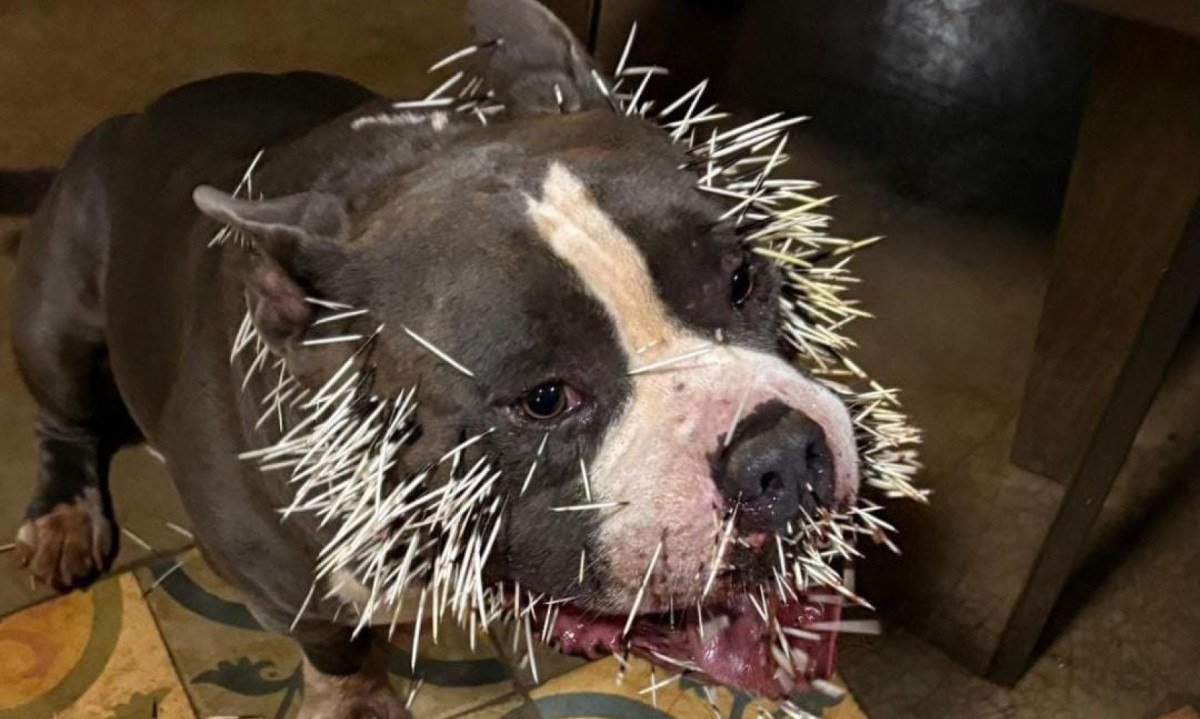 Um cachorro da raça American Bully foi atacado por um ouriço-cacheiro em Uberlândia, no Triângulo Mineiro, na manhã desta sexta-feira (16/1).