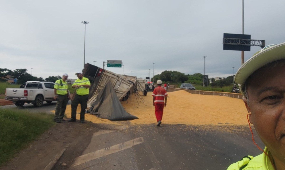 BH: caminhão com milho tomba e complica trânsito no Anel Rodoviário