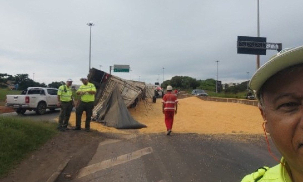 A intervenção na via foi provocada pelo tombamento de uma carreta que transportava milho no sentido Vitória (ES)