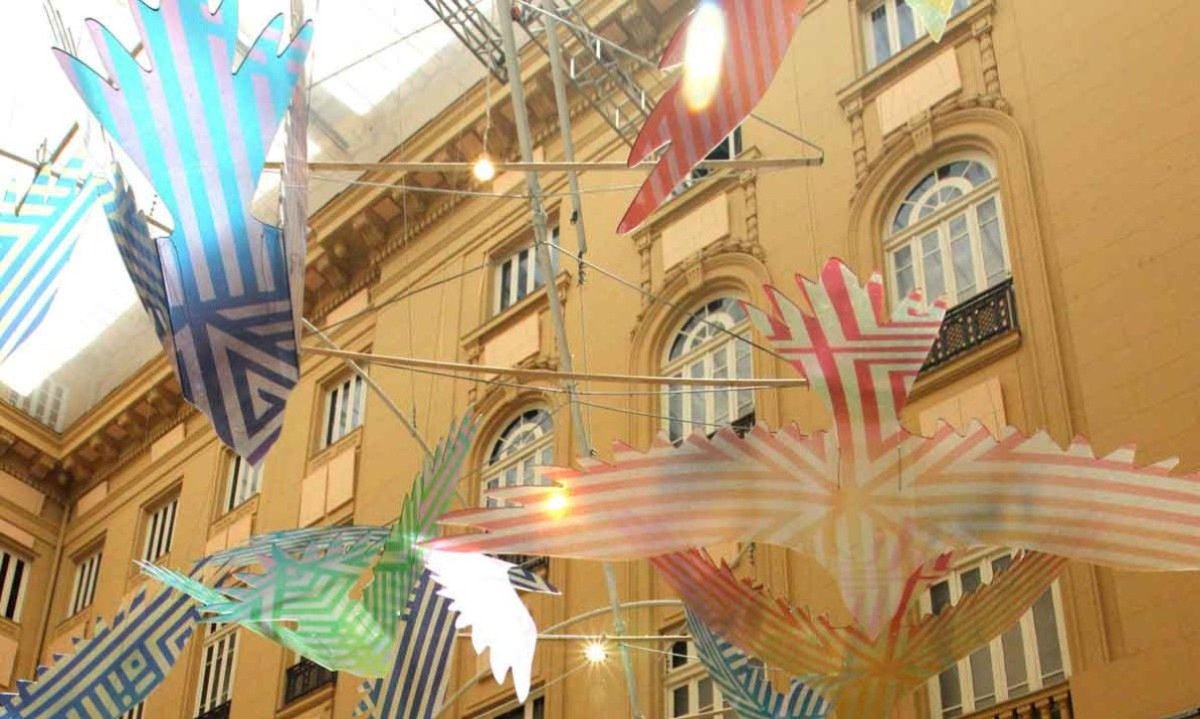 No pátio, a instalação “Festa no céu”, da artista indígena Daiara Tukano, completa o clima de encantamento. Com mais de 100 pássaros translúcidos suspensos, a obra dialoga com a luz natural ao longo do dia e ganha ainda mais impacto visual ao anoitecer, transformando a visita em uma experiência visual memorável.