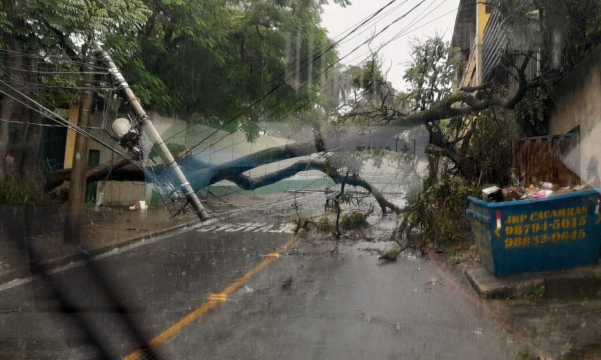 Árvore caiu atravessada na rua, bloqueando a passagem nos dois sentidos. Quatro postes foram derrubados
