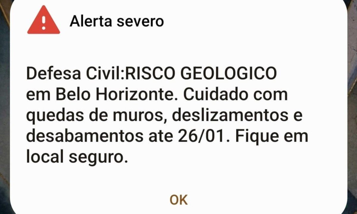 Belo Horizonte está em alerta para risco geológico até a próxima segunda-feira (26/1). O aviso foi emitido pela Defesa Civil municipal nesta quarta-feira (21/1).