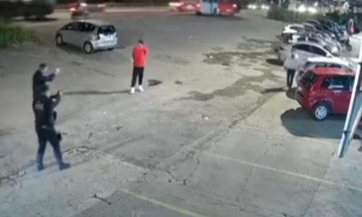 As imagens mostram o momento em que o homem ameaça populares, que fogem do local. Em seguida, agentes ordenam que ele jogue o facão no chão, mas a ordem não é obedecida, culminando no disparo.