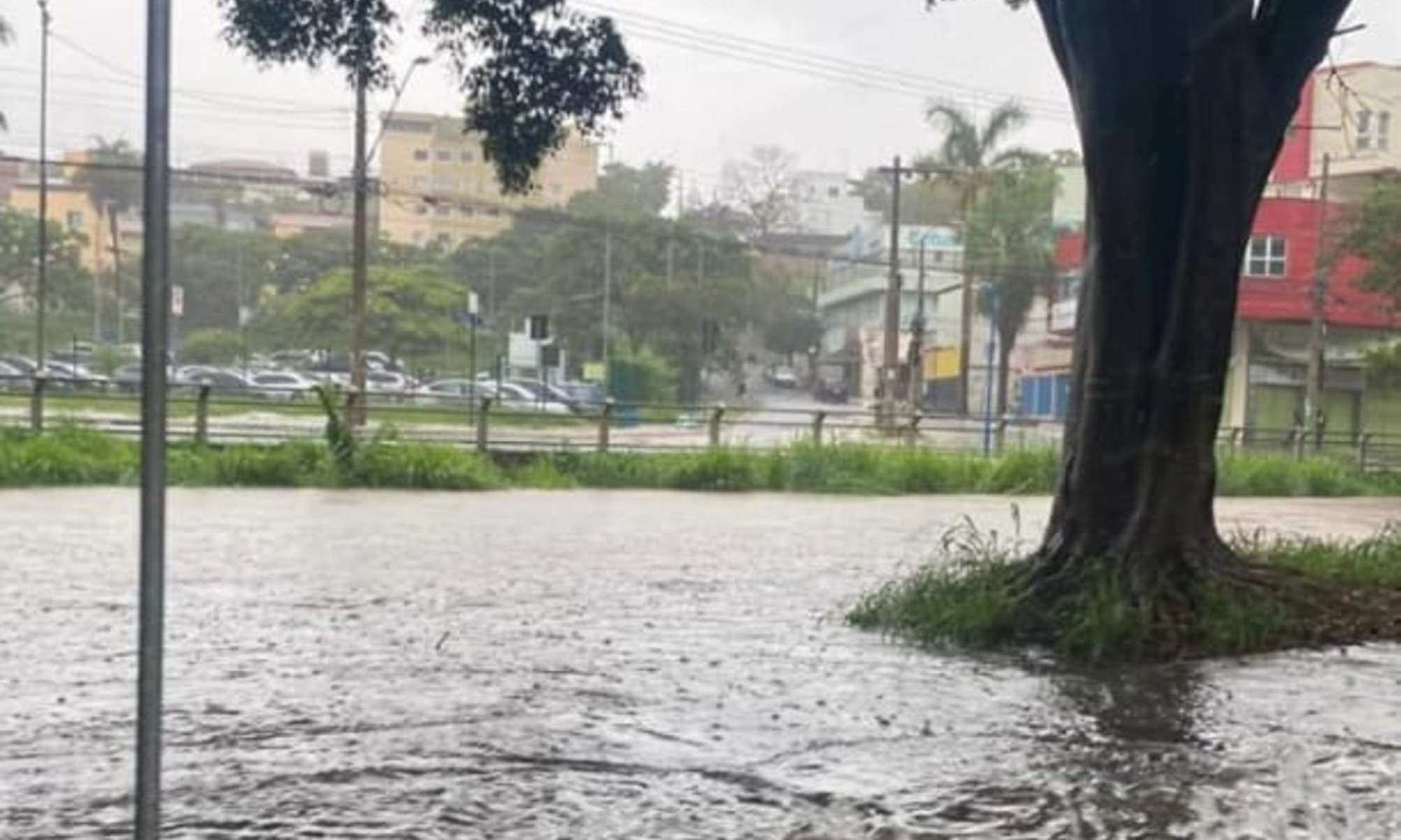 A Avenida Edmeia Matos Lazzarotti, em Betim, Região Metropolitana de Belo Horizonte, ficou alagada na altura do Hospital Público Regional Prefeito Osvaldo Rezende Franco, neste domingo (4/1). Um vídeo compartilhado nas redes sociais mostra a água já atingindo a altura da calçada.