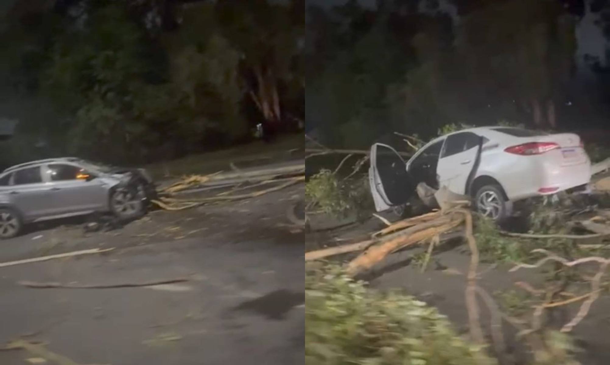 Devido à chuva constante que atinge a região nos últimos dias, um eucalipto de grande porte caiu em cima dos carros logo depois do acidente, mas os veículos já estavam desocupados.