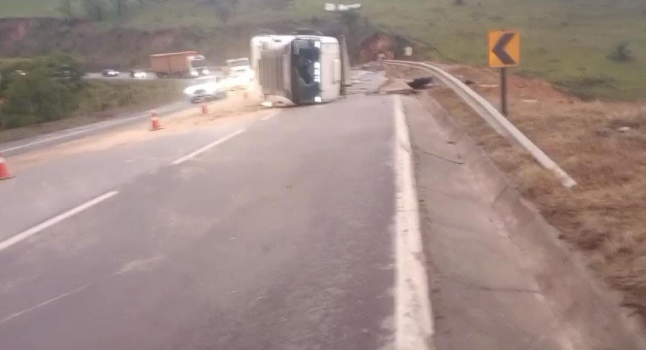 Em imagens que circulam nas redes sociais, é possível ver os veículos transitando lentamente e alguns cones de sinalização ao lado da carreta tombada.