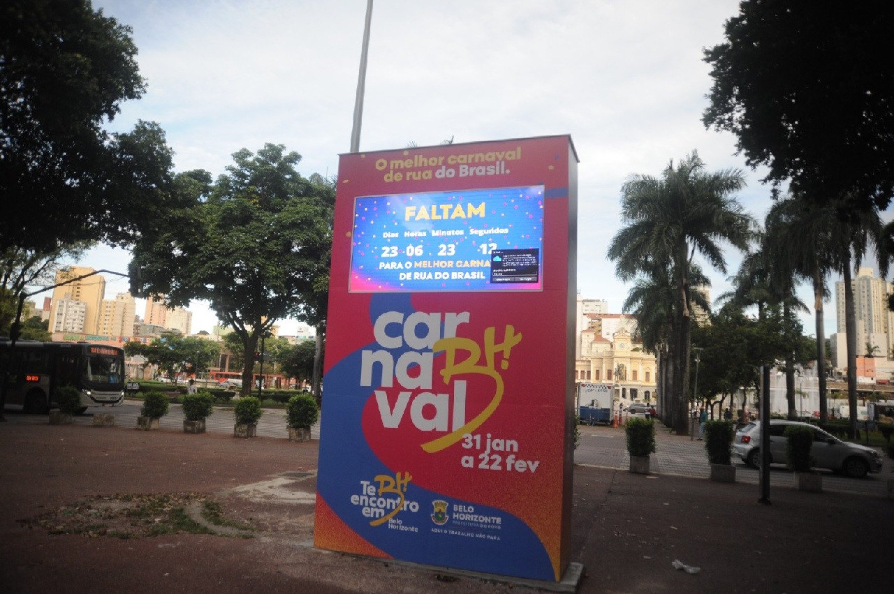 Faltam pouco mais de 23 dias para o Carnaval, e quem passa pela Praça Rui Barbosa, em frente à Praça da Estação, no Hipercentro Belo Horizonte, poderá acompanhar, minuto a minuto, o tempo que ainda resta para o início da festa popular, que começa em 31 de janeiro. É que, naquele local, a prefeitura da capital instalou um totem, com relógio eletrônico, que marca a contagem regressiva para a folia.