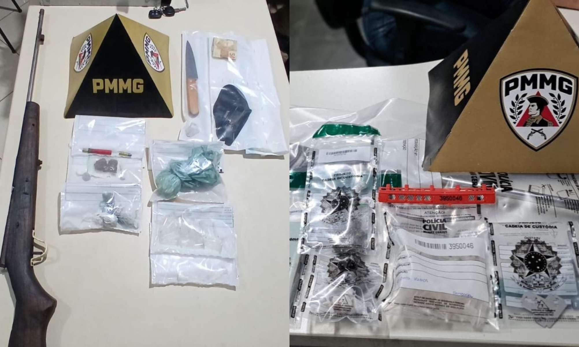 No imóvel, foram encontrados os três adolescentes. Chegaram equipes de apoio e, durante busca, foram apreendidos uma arma de fogo longa municiada, de calibre .36, munições avulsas, drogas similares a cocaína, crack e maconha, dinheiro em espécie, um celular, uma faca, além de material para embalar a droga.