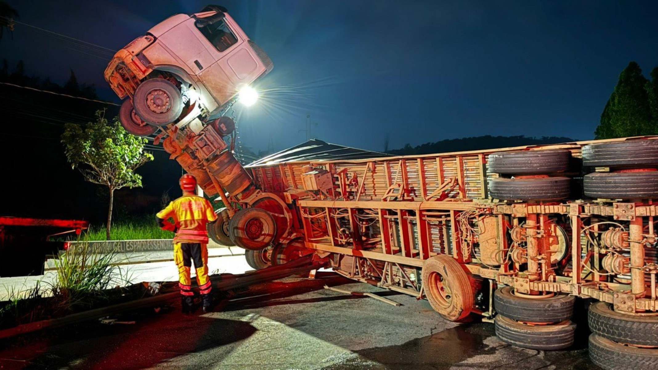 O veículo tinha uma carga de carvão e tombou na Rua Quatro, no bairro Brasiléia. De acordo com o Corpo de Bombeiros Militar de Minas Gerais (CBMMG), com o tombamento da carga, a carreta ficou em formato de “L” e a cabine ficou suspensa a cinco metros de altura.
