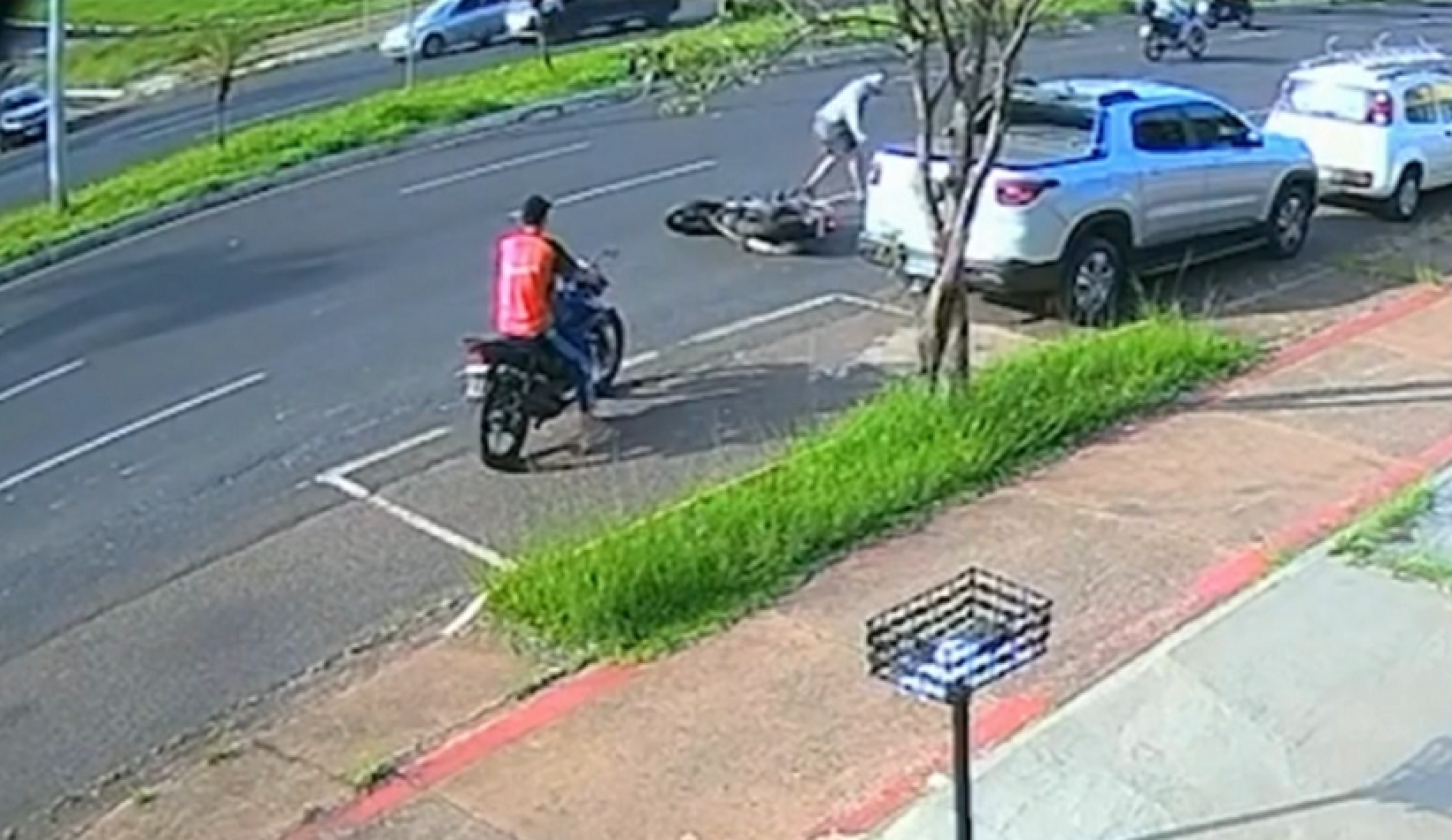 As imagens mostram dois suspeitos chegando em outra motocicleta. O garupa desce, vai até uma moto estacionada e tem dificuldade para ligá-la, enquanto o comparsa fica de olheiro no meio do trânsito da avenida Rondon Pacheco.
