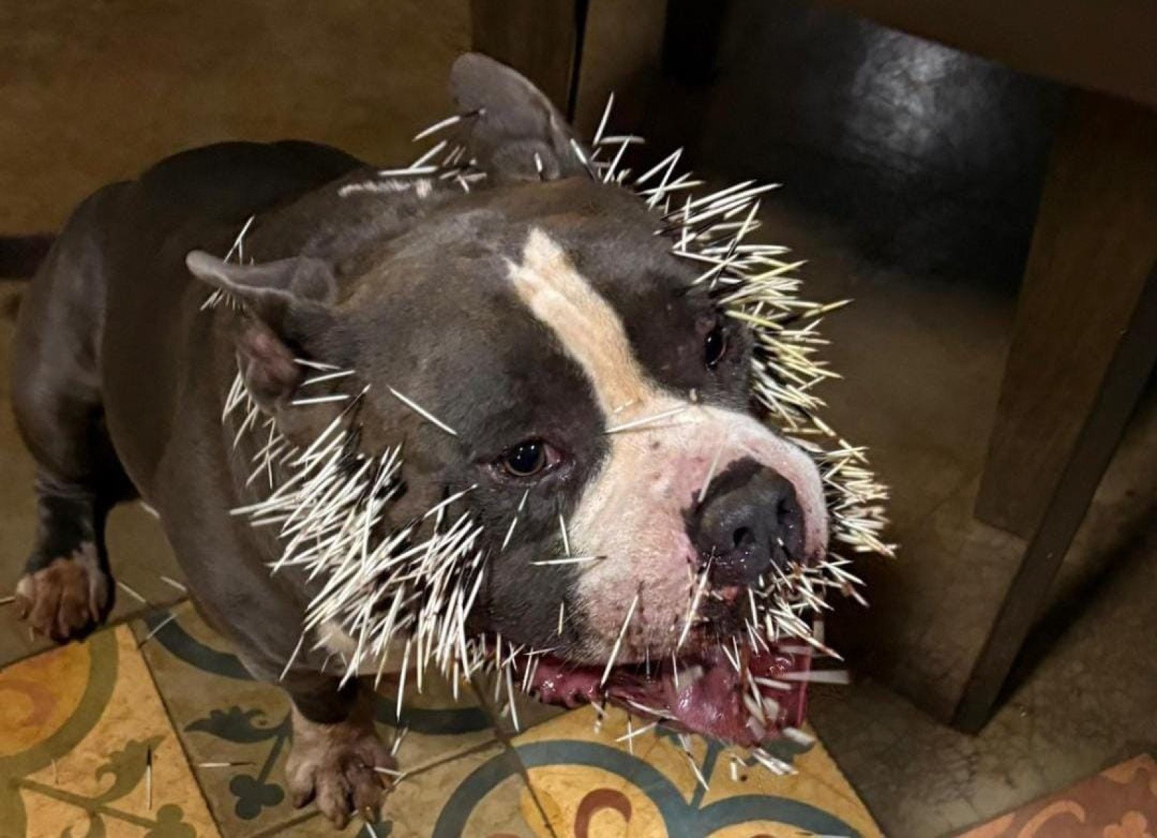 Um cachorro da raça American Bully foi atacado por um ouriço-cacheiro em Uberlândia, no Triângulo Mineiro, na manhã desta sexta-feira (16/1).