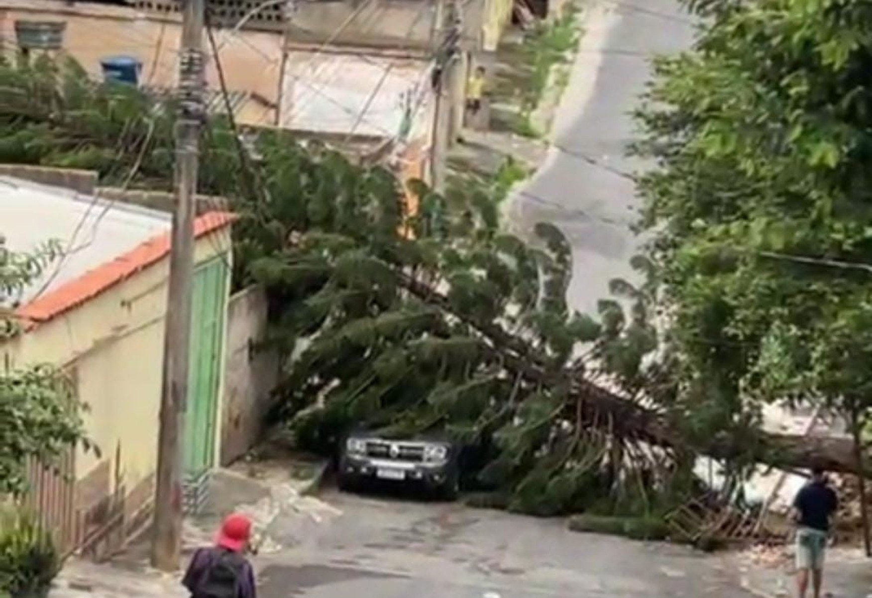 Um pinheiro de grande porte caiu na Rua Juarez, Bairro União, Região Nordeste de BH, em decorrência dos fortes ventos nesse sábado (17/1), de acordo com o Corpo de Bombeiros Militar de Minas Gerais (CBMMG). A árvore caiu sobre o portão de um imóvel e sobre fios de um poste, provocando queda de energia, que persiste até este domingo (18/1).