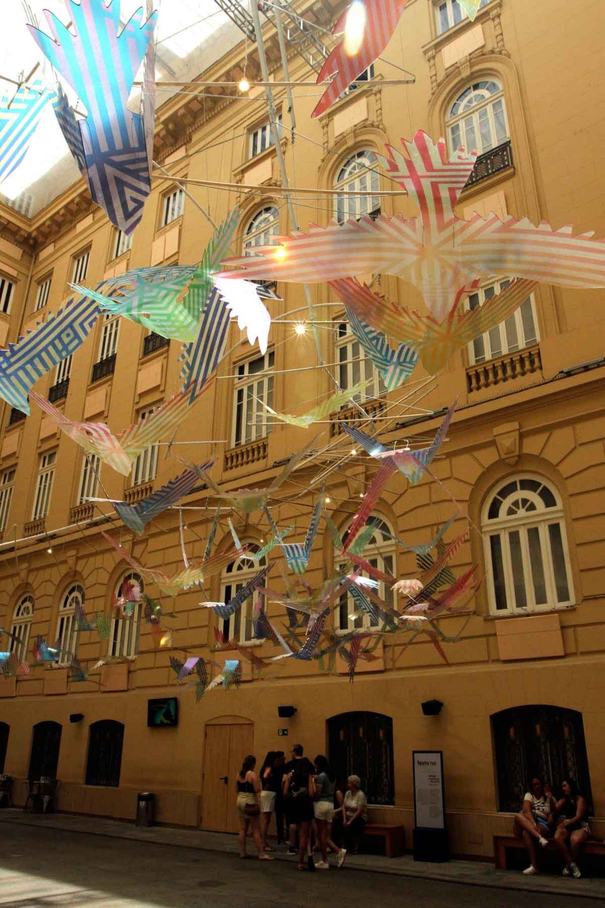 No pátio, a instalação “Festa no céu”, da artista indígena Daiara Tukano, completa o clima de encantamento. Com mais de 100 pássaros translúcidos suspensos, a obra dialoga com a luz natural ao longo do dia e ganha ainda mais impacto visual ao anoitecer, transformando a visita em uma experiência visual memorável.