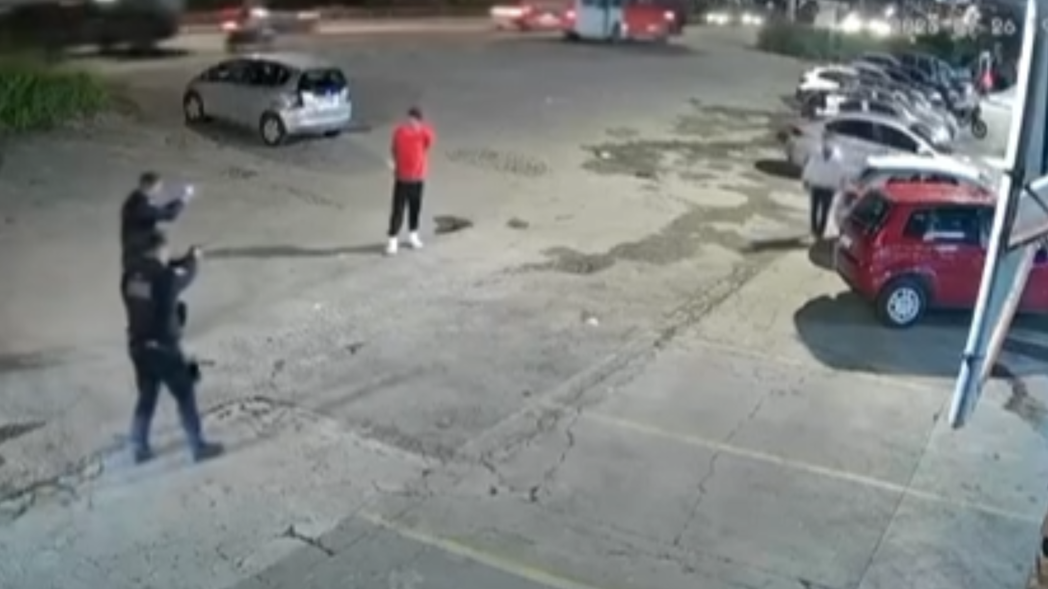 As imagens mostram o momento em que o homem ameaça populares, que fogem do local. Em seguida, agentes ordenam que ele jogue o facão no chão, mas a ordem não é obedecida, culminando no disparo.