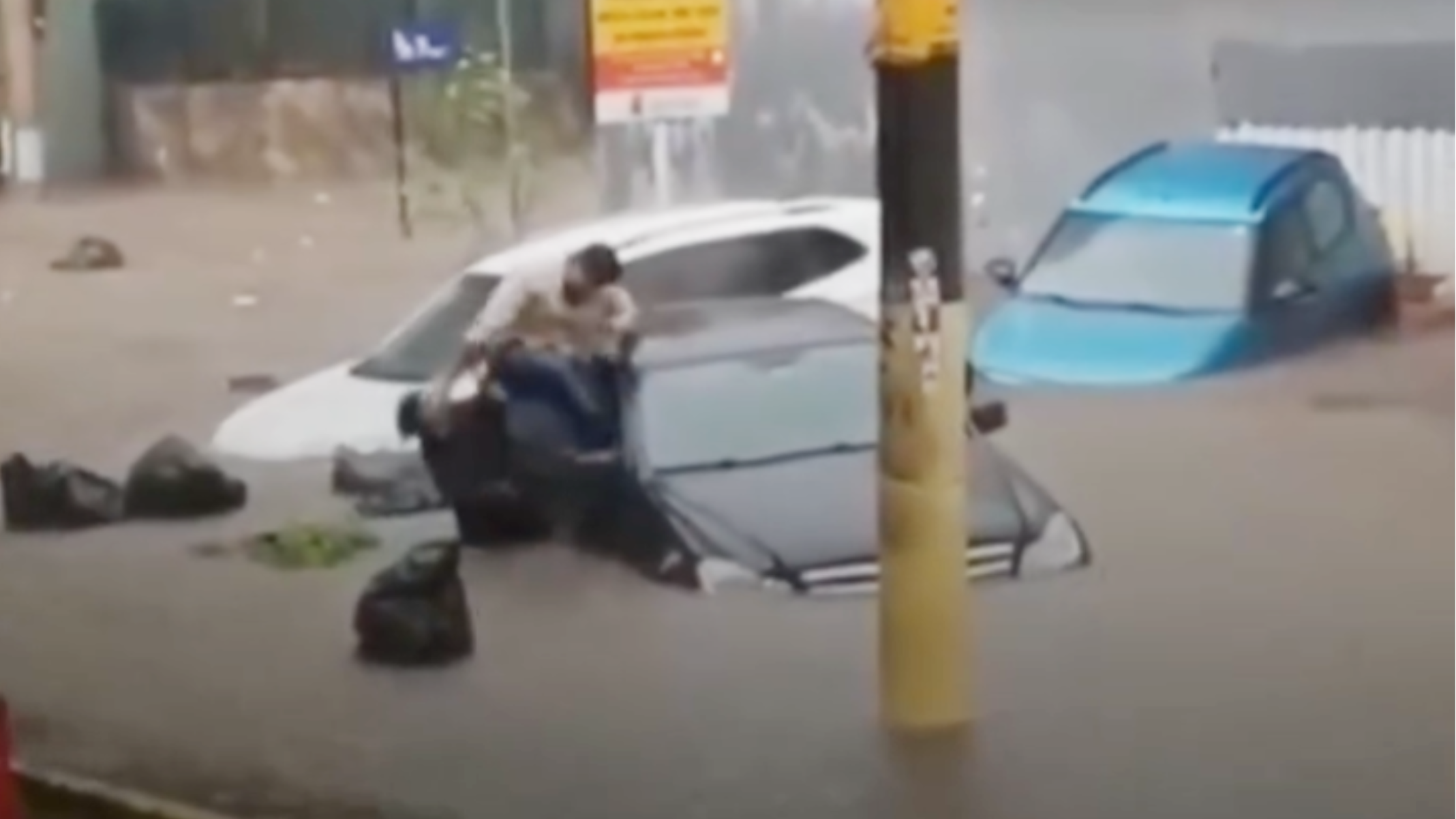 Nas imagens, é possível ver um homem auxiliando o motorista de uma Mercedes que ficou preso dentro do carro em meio à enxurrada. Ao sair pela janela do veículo, o condutor chega a cair na água, mas consegue se levantar e caminhar até uma área segura.