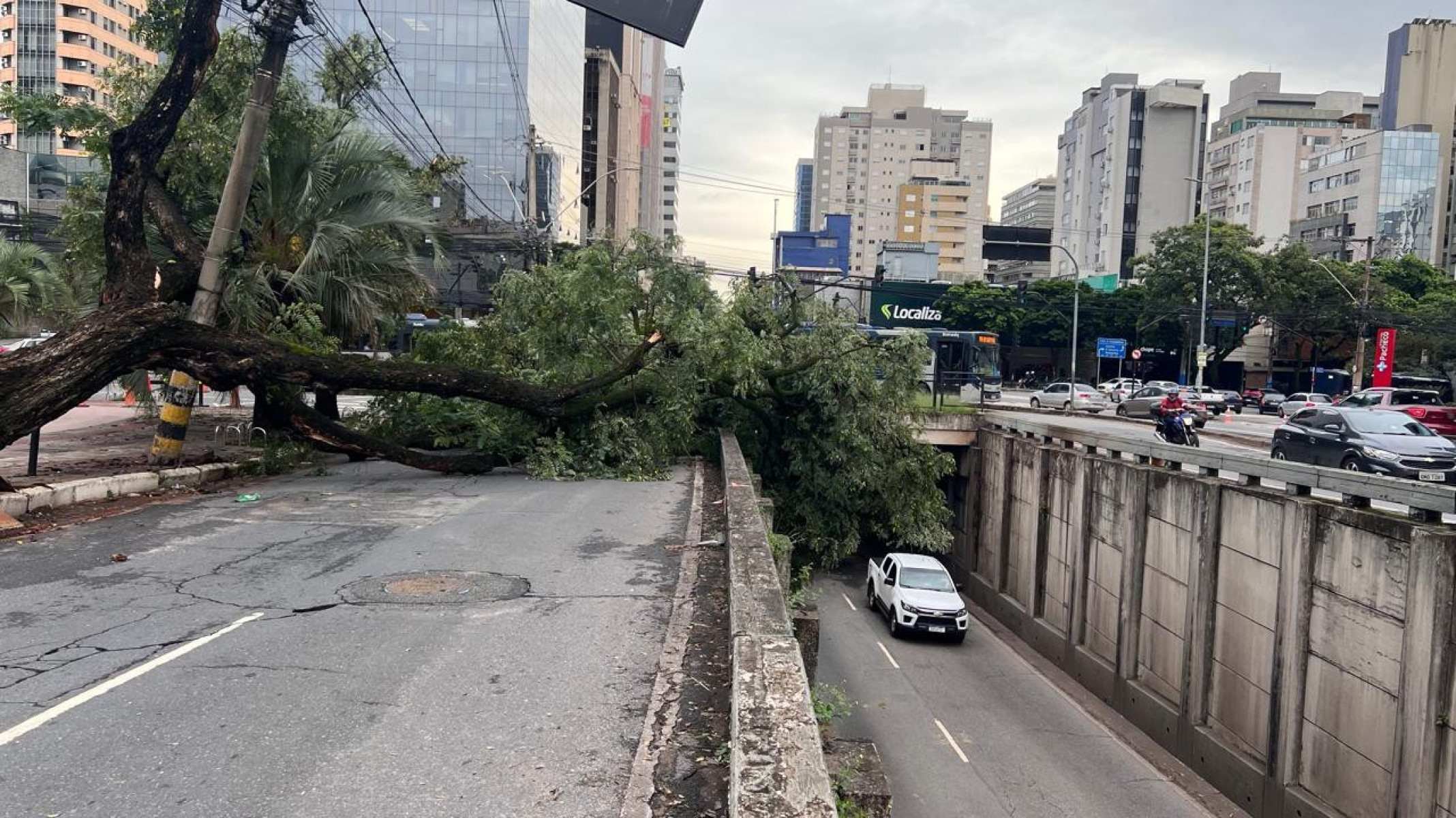 Uma árvore de grande porte caiu em frente ao Shopping Pátio Savassi nessa quinta-feira (29/1), na Avenida Nossa Senhora do Carmo, na Região Centro-Sul de Belo Horizonte (MG), em decorrência do forte temporal que atingiu a capital mineira.