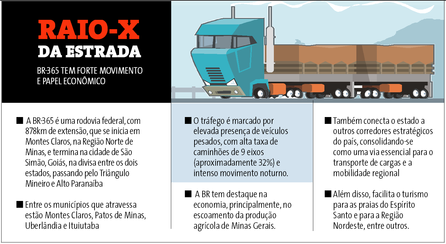 O diretor científico da Associação Mineira de Medicina do Tráfego (Ammetra), Alysson Coimbra, destaca que o país tem um cenário de rodovias antigas, que não foram condicionadas para absorver o atual fluxo de veículos. “Temos um crescimento da economia, vinculado ao aumento da circulação de veículos de grande porte porque o escoamento da produção, no Brasil, é majoritariamente feito pelo transporte rodoviário”, afirma. Ele ressalta que a BR-365 é uma rota usada para escoar a produção do agronegócio, além de Uberlândia também ter um centro de distribuição de produtos da Amazon. “O Triângulo Mineiro virou um local estratégico de distribuição de mercadorias, pela localização”, frisa.