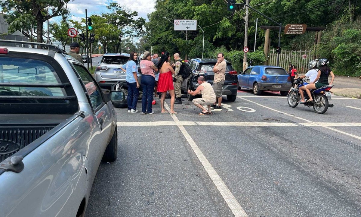 Um motociclista se envolveu em um acidente com três carros na tarde deste sábado (14/2), na Via do Minério, na Região do Barreiro, em Belo Horizonte (MG).