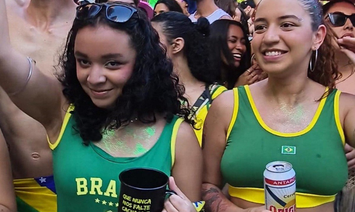 O casal Júlia e Karen escolheu blusas nas cores do Brasil para curtir o bloco da banda Lagum, na Avenida Brasil, na Região Centro-Sul da capital. “Dei a ideia. Queríamos mostrar que somos muito orgulhosas de sermos latinas”, conta Júlia.