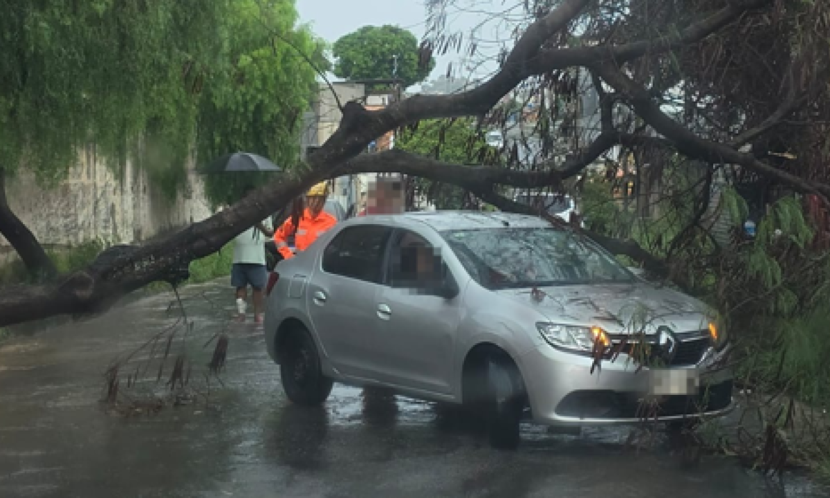 Belo Horizonte registrou chuva forte na tarde deste sábado (21/2), e uma das consequências foi a queda de uma árvore sobre um carro no Bairro Maria Goretti, na Região Nordeste.