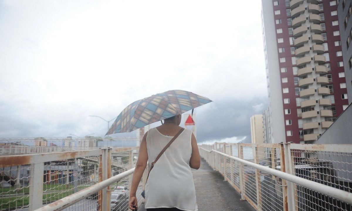 Conforme a previsão, o dia é de céu nublado a parcialmente nublado com pancadas de chuva, acompanhadas de raios e rajadas de vento.