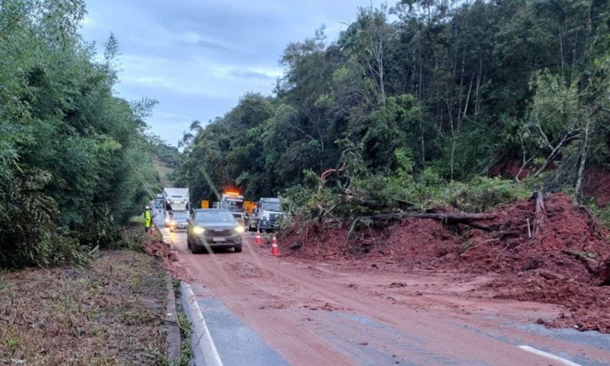A chuva forte que atingiu a região na noite dessa quarta-feira (25/2) afetou o tráfego na rodovia, que fica a 42 quilômetros de Juiz de Fora (MG). Segundo a concessionária EPR Via Mineira, às 2h17 foi registrado um primeiro deslizamento de materiais para a pista , no mesmo quilômetro, em Ewbank da Câmara.