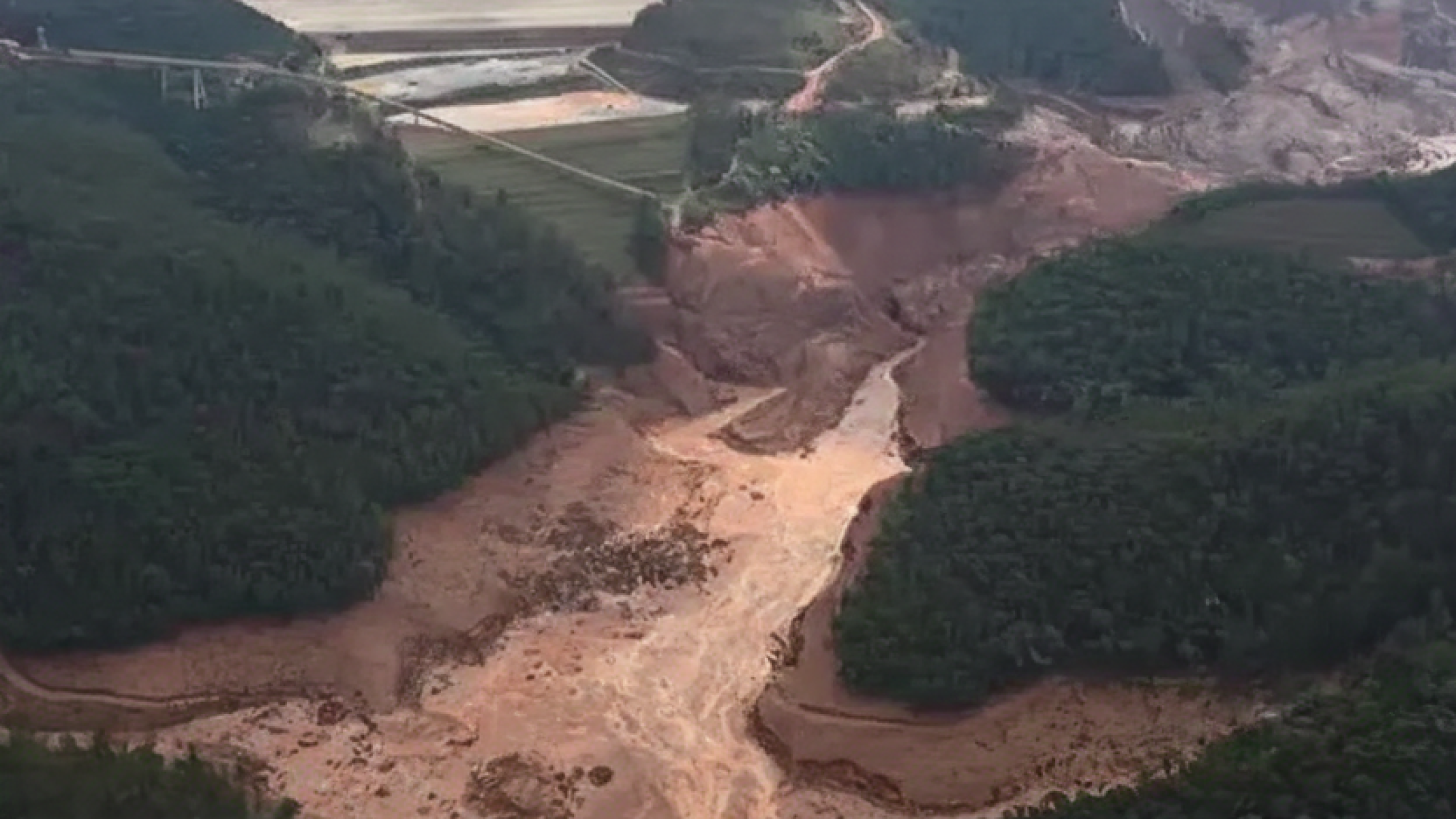 Estrago da inundação de lama e rejeitos provocada pelo transbordamento na Mina de Viga, da Vale, em Congonhas