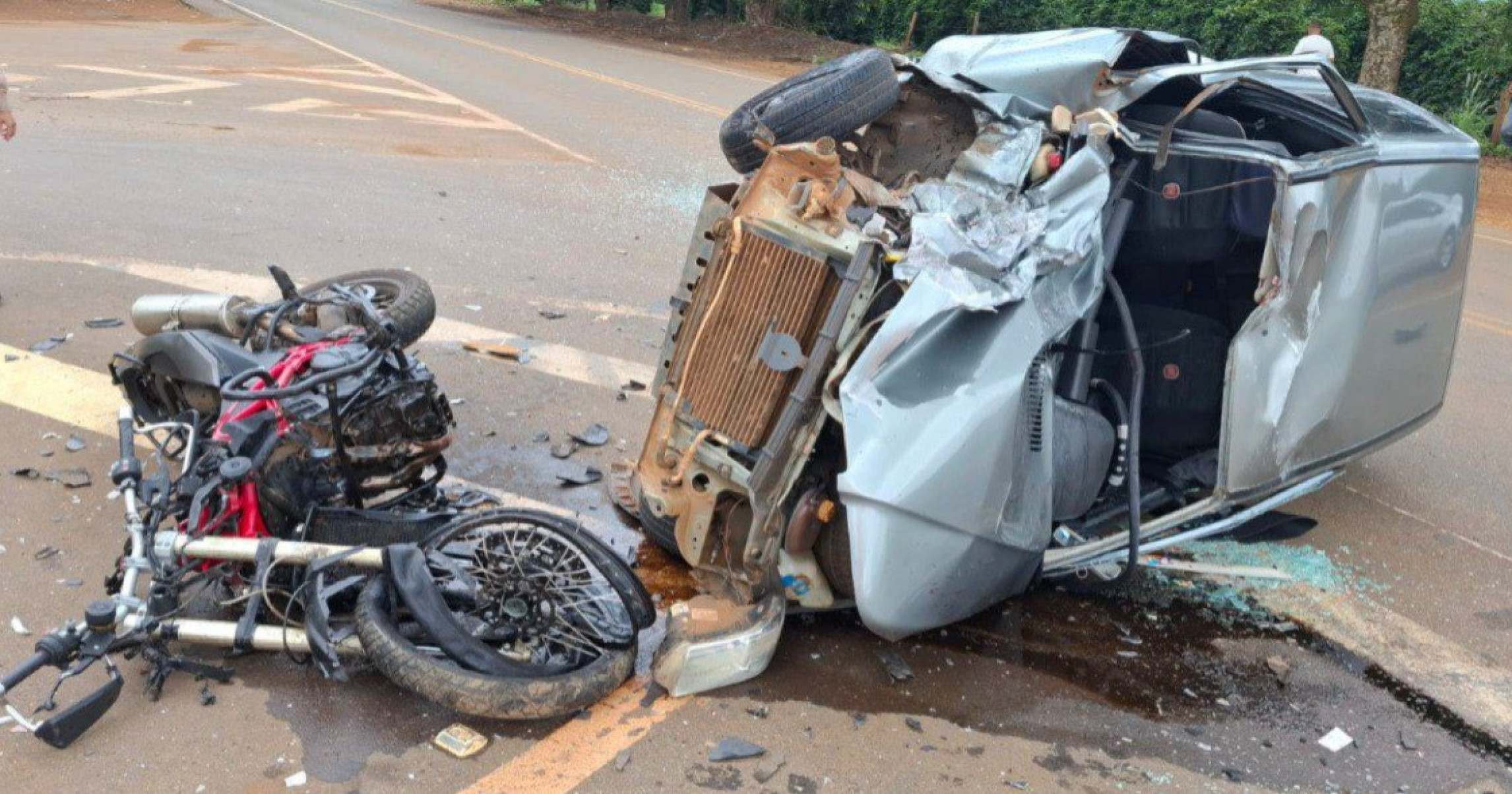 Em registro divulgado pelo CBMMG, é possível ver o carro tombado e com danos na parte da frente, lateral e em cima do veículo — o que pode indicar que o automóvel capotou. O para-brisa e o para-choque ficaram totalmente destruídos. Na imagem, a motocicleta aparece caída na via e também danificada.