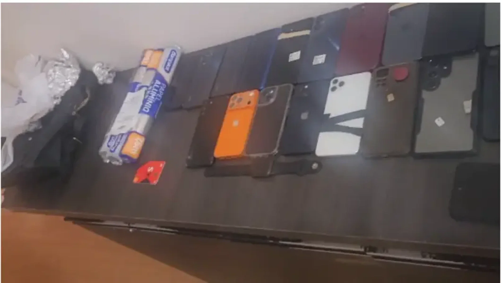 Com a intenção de bloquear o sinal, os suspeitos embrulharam vários telefones com papel alumínio. A prática já é conhecida e usada também em tornozeleiras eletrônicas.