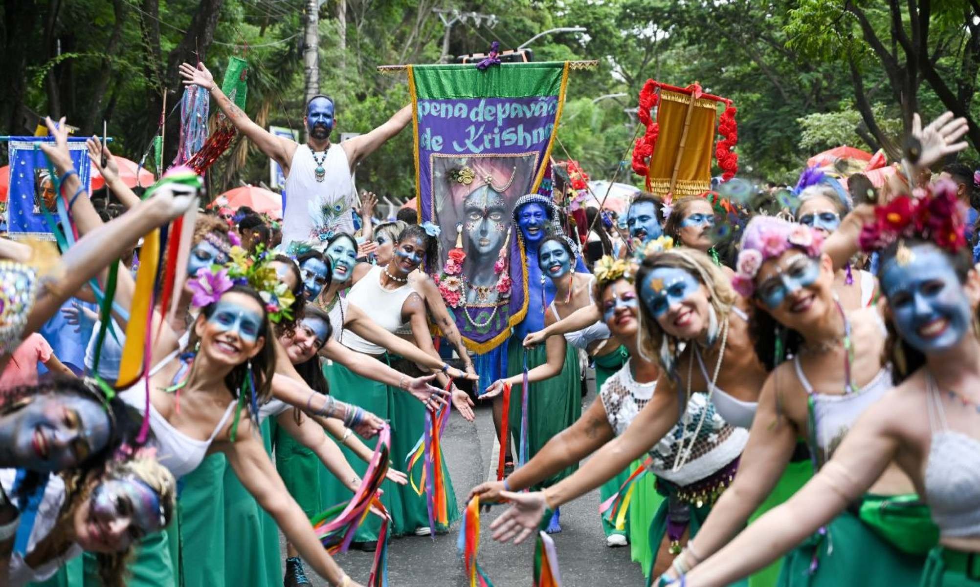 E um dos blocos mais politizados do Carnaval de Belo Horizonte é o Pena de Pavão de Krishna, que une a cultura brasileira com a indiana em uma mistura repleta de emoção e de um forte azul dominando as ruas da capital.