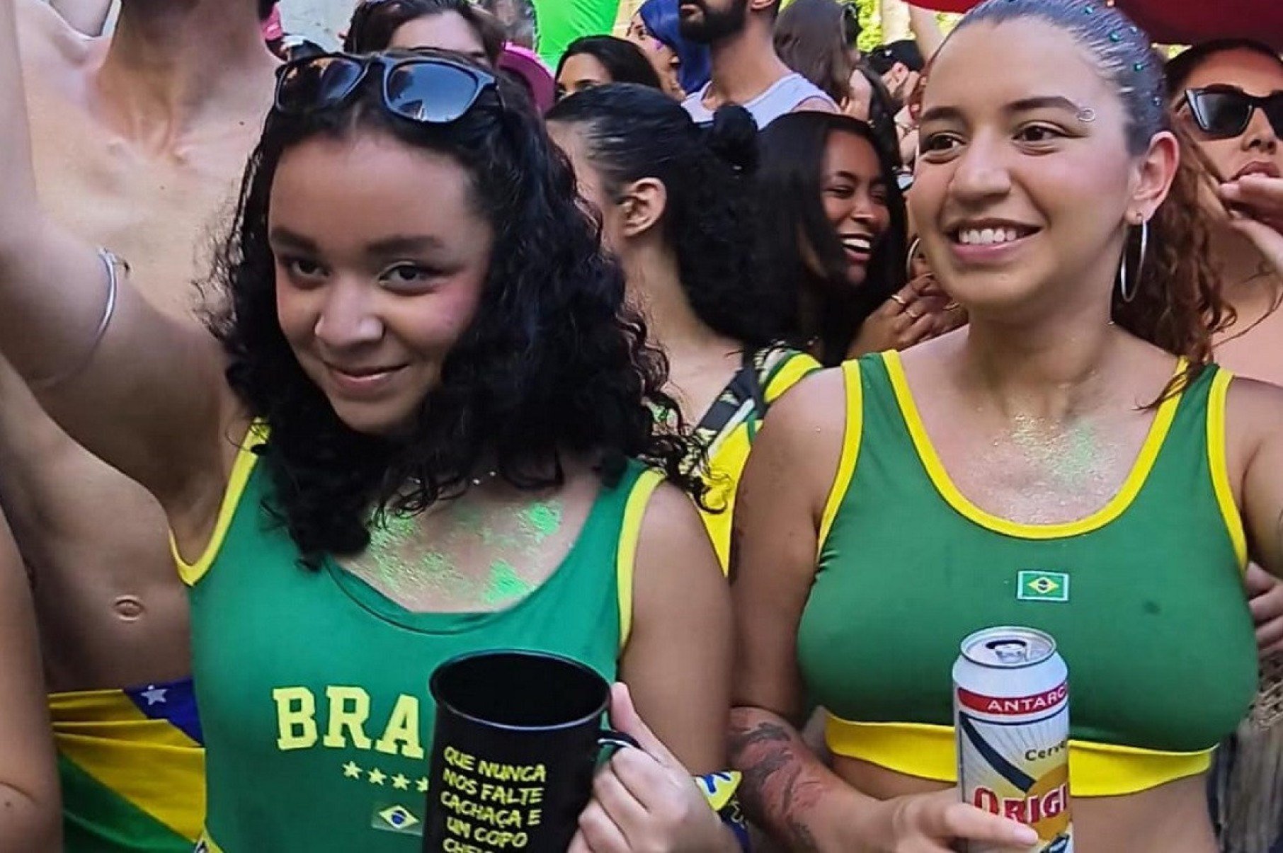 O casal Júlia e Karen escolheu blusas nas cores do Brasil para curtir o bloco da banda Lagum, na Avenida Brasil, na Região Centro-Sul da capital. “Dei a ideia. Queríamos mostrar que somos muito orgulhosas de sermos latinas”, conta Júlia.