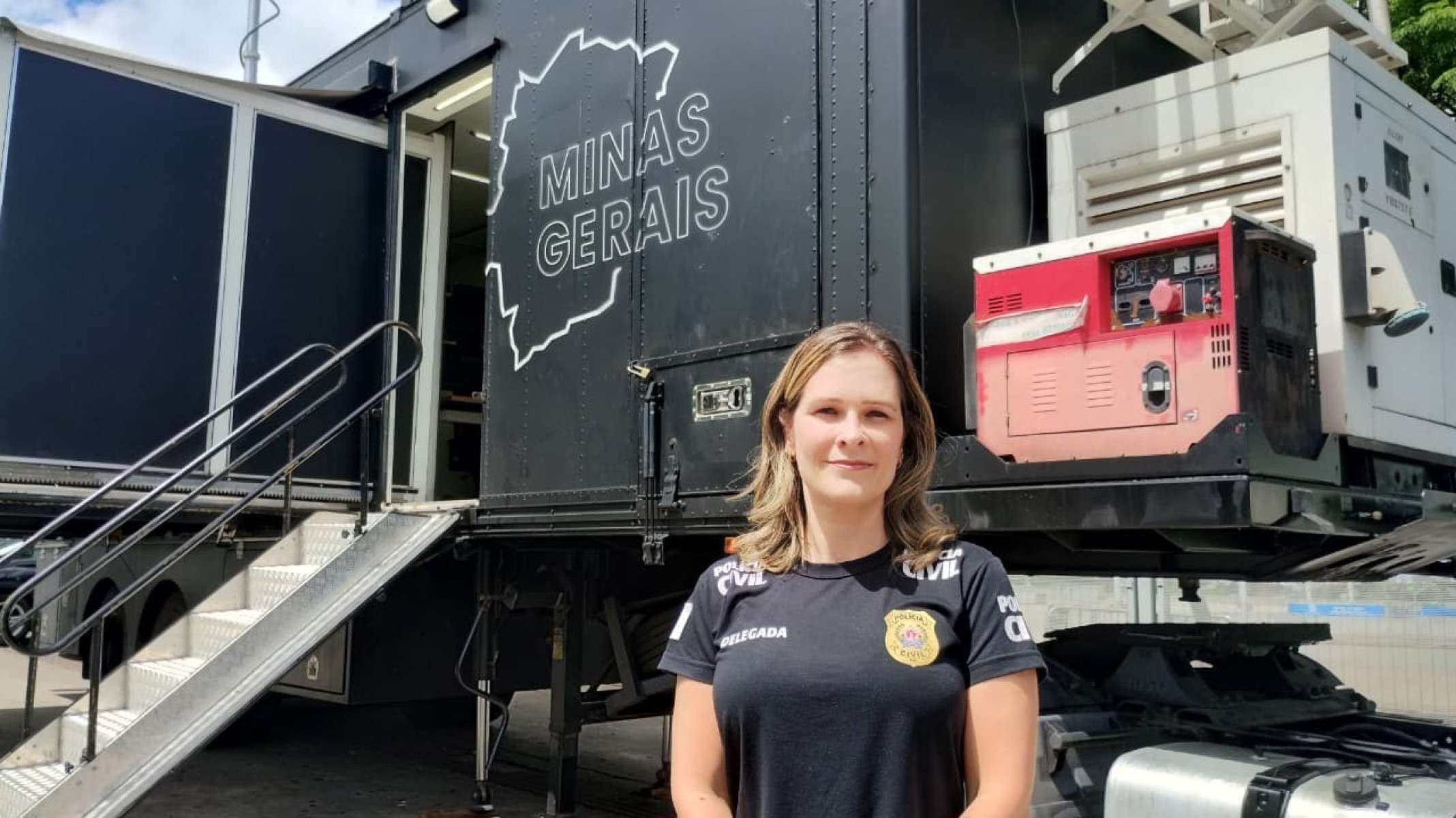 A delegada Bianca Landau também está presente na carreta e detalha que todos os tipos de ocorrência podem ser realizados na central móvel.