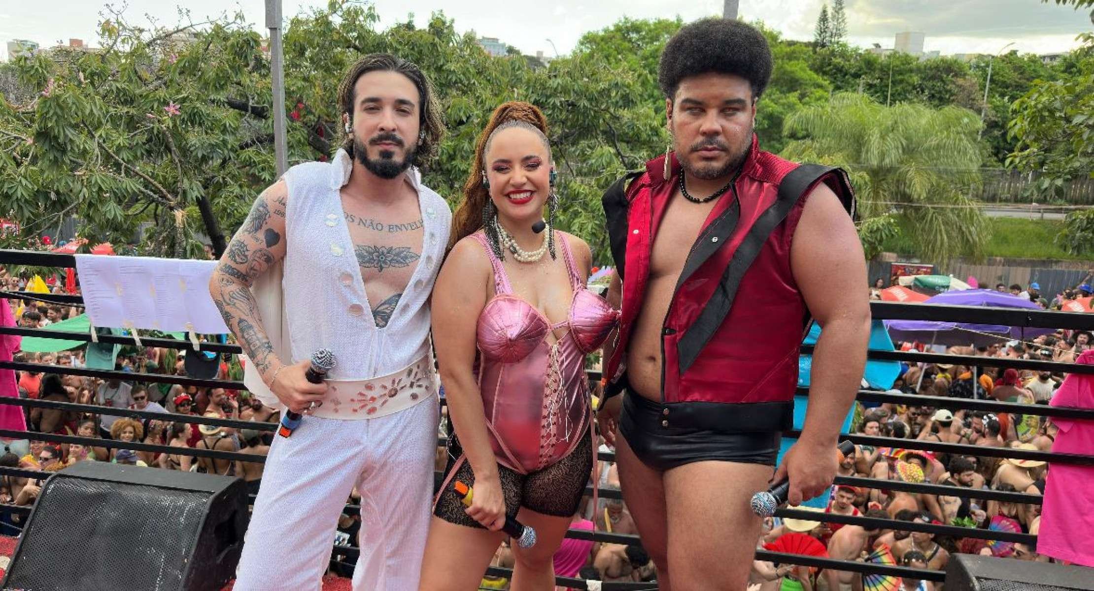 “A gente pensou em celebridades que pudessem transpor o carnaval. Como seriam grandes ícones da rádio transportados para o carnaval. Então temos Michael Jackson, Britney Spears, Madonna e outros”, conta o figurinista Luiz Dias.