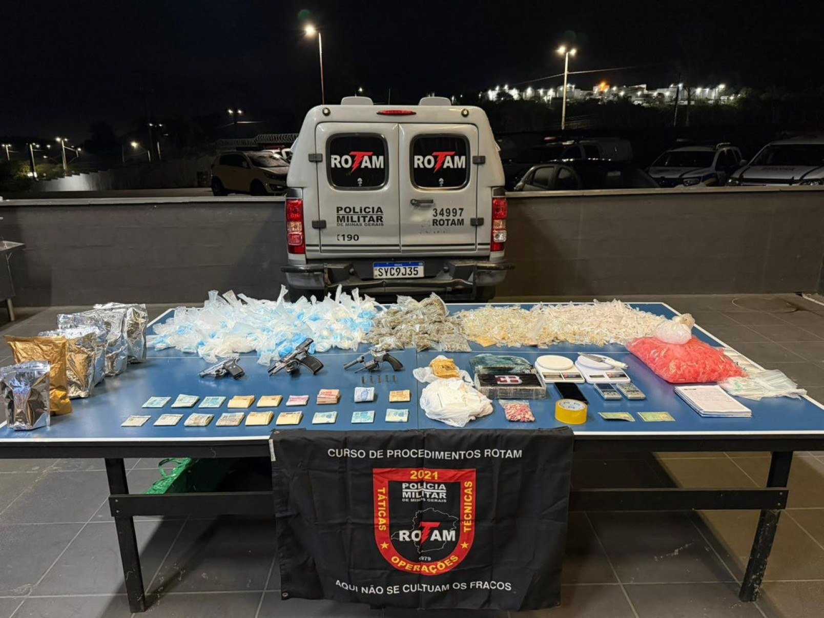 Durante a abordagem, um dos envolvidos indicou onde os entorpecentes estavam escondidos, em quartos da residência e na área de serviço. Também foram apreendidos armas e dinheiro.